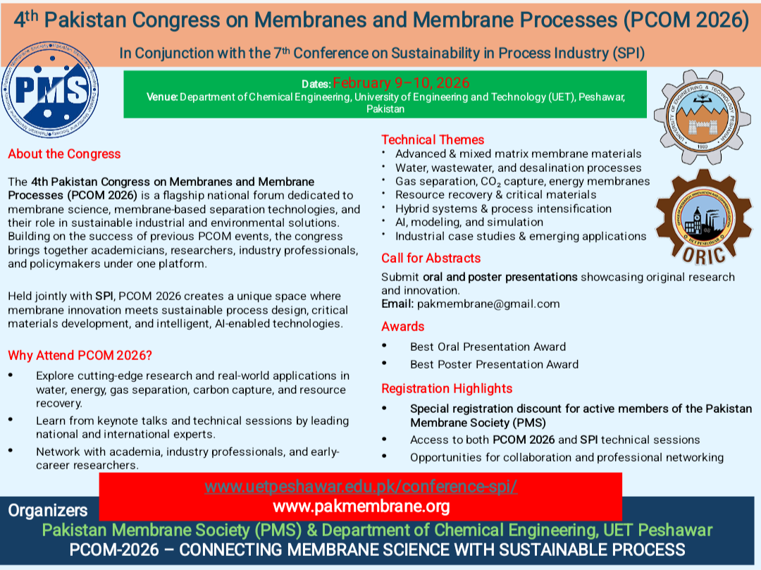 The 4th Pakistan Congress on Membranes and Membrane Processes (PCOM 2026) is a flagship national forum dedicated to membrane science, membrane-based separation technologies, and their role in sustainable industrial and environmental solutions. Building on the success of previous PCOM events, the congress brings together academicians, researchers, industry professionals, and policymakers under one platform.